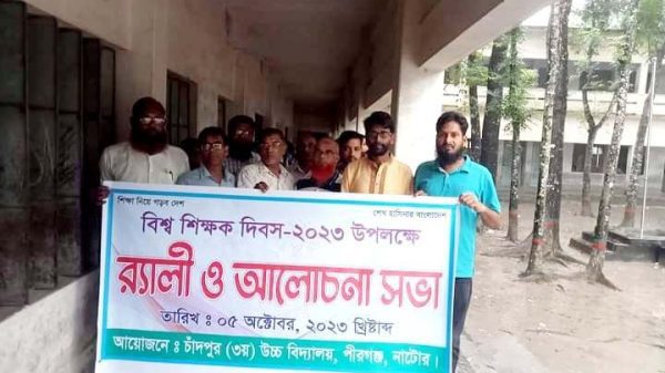 নাটোরে বিশ্ব শিক্ষক দিবস উপলক্ষে র্যালি ও আলোচনা সভা অনুষ্ঠিত হয়েছে । আজ বৃহস্পতিবার (৫ অক্টোবর) নাটোরের চাঁদপুর (৩য়) উচ্চ বিদ্যালয়ের সামনে থেকে এক র্যালি বের হয়ে বিদ্যালয়ের প্রাঙ্গণে এসে শেষ হয় । পরে বিদ্যালয়ের কমনরুমে বিশ্ব শিক্ষক দিবস পালনের আলোচনা সভা অনুষ্ঠিত হয়েছে।