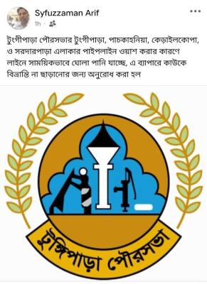 তিনি তার ফেসবুক আইডিতে লিখেছেন, টুঙ্গিপাড়া পৌরসভার টুঙ্গিপাড়া, পাঁচ কাহানিয়া, কেড়ালকোপা ও সরদারপাড়া এলাকায় পাইপ লাইন ওয়াশ করার কারণে লাইনে সাময়িকভাবে ঘোলা পানি যাচ্ছে। এ ব্যাপারে কাউকে বিভ্রান্তি না ছড়ানোর জন্য অনুরোধ করা হলো।
