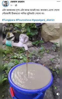 পৌরসভার সরবরাহকৃত পানির লাইন থেকে সম্পূর্ণ ঘোলা পানি বালতির মধ্যে পড়া নিয়ে সামাজিক যোগাযোগমাধ্যম ফেসবুকে তোলপাড় সৃষ্টি হয়েছে।
