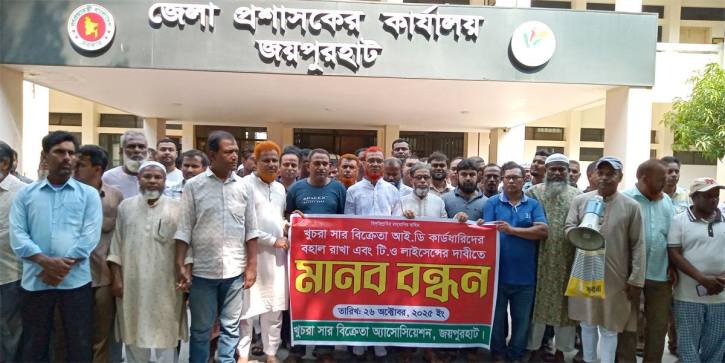 জয়পুরহাটে খুচরা সার বিক্রেতা আইডি কার্ডধারীদের লাইসেন্স বহাল রাখা ও টি.ও. লাইসেন্স রক্ষার দাবিতে মানববন্ধন অনুষ্ঠিত হয়েছে।