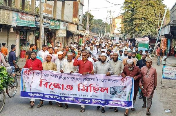 রাজশাহীর দুর্গাপুরে লগি-বৈঠার তান্ডব চালিয়ে নিরীহ মানুষ হত্যাকারীদের দ্রুত বিচারের দাবিতে বাংলাদেশ জামায়াতে ইসলামী’র উদ্যোগে এক বিক্ষোভ মিছিল অনুষ্ঠিত হয়েছে।