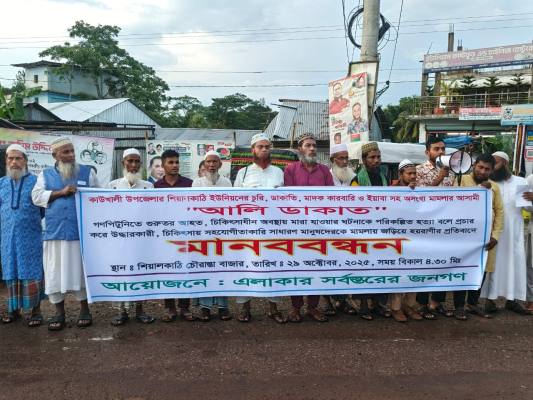 বুধবার (২৯ অক্টোবর) বিকেলে কাউখালী উপজেলার পিরোজপুর-বরিশাল সড়কের চৌমাথা এলাকায় ঘণ্টাব্যাপী এ মানববন্ধন অনুষ্ঠিত হয়। এতে এলাকার সর্বস্তরের জনগণ অংশ নেন।