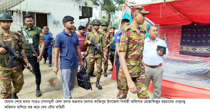 মেয়াদ শেষ হলেও চলছিলো সিরাজগঞ্জের কাজিপুর উপজেলার ঐতিহ্যবাহী সোনামুখী মেলা। প্রশাসনের নির্দেশনা অমান্য করে মেলা চালিয়ে যাওয়ায় অবশেষে উচ্ছেদ অভিযান চালিয়েছে উপজেলা প্রশাসন।