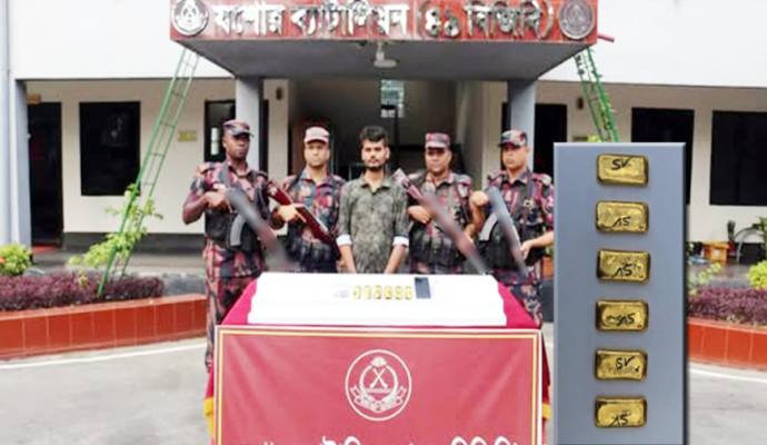 শুক্রবার (৩১ অক্টোবর) যশোর ব্যাটালিয়ন (৪৯ বিজিবি)-এর একটি টহল দল দাইতলা ব্রিজ এলাকায় অভিযান চালিয়ে তাকে আটক করে। এ সময় তার কাছ থেকে ৬টি স্বর্ণের বার, ২টি মোবাইল ফোন ও নগদ ৯ হাজার ৮৭ টাকা উদ্ধার করা হয়। উদ্ধারকৃত স্বর্ণের বাজারমূল্য ১ কোটি ২৬ লাখ ৮ হাজার ৯২৫ টাকা।