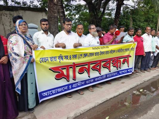 যশোরে গ্রামীণ ডাক কর্মচারী ইউনিয়ন, জেলা শাখার উদ্যোগে মানববন্ধন অনুষ্ঠিত হয়েছে। কর্মচারীরা বর্তমান বাজারমূল্যের সঙ্গে সঙ্গতিপূর্ণ বেতন কাঠামো, ন্যূনতম জীবনযাপনের নিশ্চয়তা এবং বাইসাইকেল ও পোশাক সরবরাহের দাবি জানিয়েছেন।