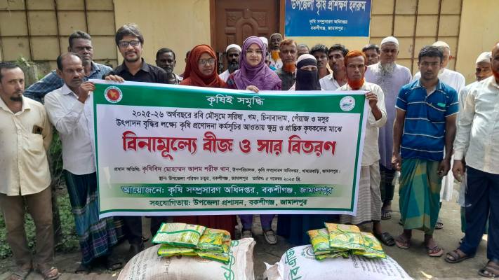 জামালপুরের বকশীগঞ্জে ২০২৫-২৬ অর্থ বছরে রবি মওসুমে কৃষি প্রণোদনা কর্মসূচির আওতায় বিনামূল্যে বীজ ও সার বিতরণ করা হয়েছে।