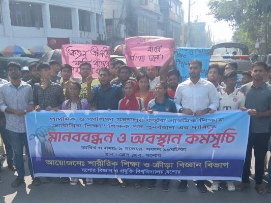 যশোরে সংগীত ও শারীরিক শিক্ষকের পদ বাতিলের প্রতিবাদে মানববন্ধন
