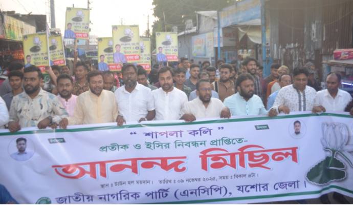 নির্বাচন কমিশনের নিবন্ধন ও শাপলা কলি প্রতীক পাওয়ায় যশোরে আনন্দ মিছিল করেছে জাতীয় নাগরিক পার্টি (এনসিপি)। রোববার বিকেলে শহরের টাউন হল মাঠ থেকে আনন্দ মিছিলটি বের হয়ে শহরের দড়াটানা, চিত্রা মোড় ও চৌরাস্তা ঘুরে প্রেসক্লাব যশোরের সামনে গিয়ে শেষ হয়।