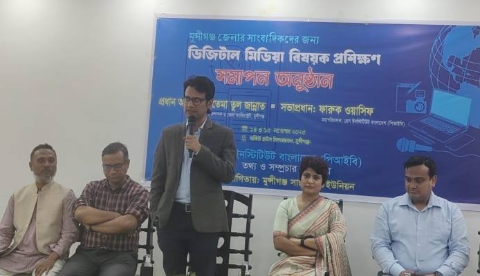 মুন্সীগঞ্জে অনুষ্ঠিত ডিজিটাল মিডিয়া বিষয়ক প্রশিক্ষণের সমাপনি অনুষ্ঠানে সাংবাদিকদের সবসময় ঐক্যবদ্ধ থাকার আহ্বান জানিয়েছেন প্রেস ইনস্টিটিউট বাংলাদেশের (পিআইবি) মহাপরিচালক ফারুক ওয়াসিফ। তিনি বলেন, “সহকর্মীর সহযোগিতায় এগিয়ে যেতে হবে, গুজব প্রতিরোধে সচেতন থাকতে হবে এবং সংবাদ পরিবেশনের ক্ষেত্রে তথ্য যাচাইকে অগ্রাধিকার দিতে হবে। সত্য সংবাদ প্রকাশে সকল সাংবাদিককে আপোষহীন হতে হবে।”