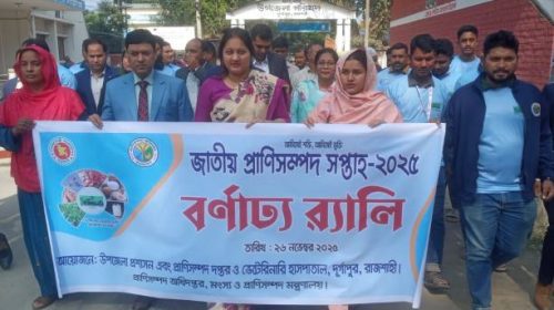 “দেশীয় জাত, আধুনিক প্রযুক্তি: প্রাণিসম্পদে হবে উন্নতি”—এই প্রতিপাদ্যকে সামনে রেখে রাজশাহীর চারঘাটে জাতীয় প্রাণিসম্পদ সপ্তাহ-২০২৫ উপলক্ষে বর্ণাঢ্য র‌্যালি, প্রাণিসম্পদ প্রদর্শনী ও আলোচনা সভা অনুষ্ঠিত হয়েছে। ২৬ নভেম্বর থেকে ২ ডিসেম্বর পর্যন্ত চলবে সাত দিনব্যাপী এ প্রদর্শনী।