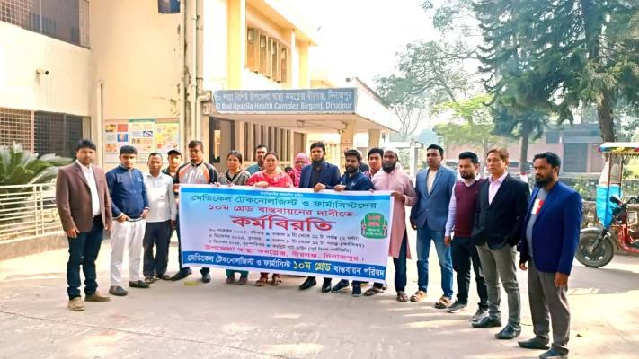 মেডিকেল টেকনোলজিস্ট ও ফার্মাসিস্টদের ১০ম গ্রেড বাস্তবায়নসহ কয়েকটি দাবির প্রতি সরকারের দৃষ্টি আকর্ষণের লক্ষ্যে দুই ঘণ্টার কর্মবিরতি পালন করেছেন বীরগঞ্জ উপজেলা স্বাস্থ্য কমপ্লেক্সসহ সরকারি–বে–সরকারি হাসপাতাল ও ডায়াগনস্টিক সেন্টারের টেকনোলজিস্ট ও ফার্মাসিস্টরা।