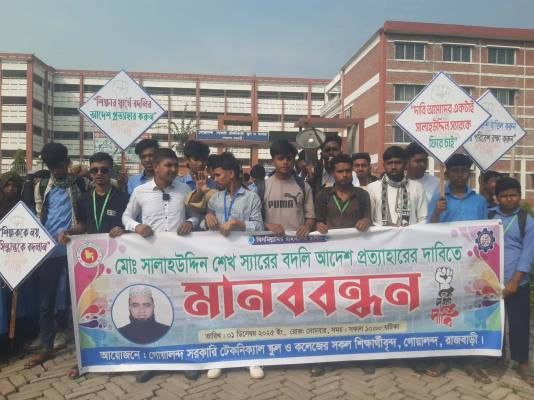 রাজবাড়ীর গোয়ালন্দে সরকারি টেকনিক্যাল স্কুল এন্ড কলেজের শিক্ষক মোঃ সালাহউদ্দিন শেখের বদলির আদেশ বাতিলের দাবিতে মানববন্ধন করেছে বিক্ষুব্ধ শিক্ষার্থীরা।