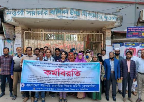 কেন্দ্রীয় নির্দেশনায় সহকারী শিক্ষক পদটি বিসিএস সাধারণ শিক্ষা ক্যাডারভুক্ত করাসহ চার দফা দাবিতে সোমবার থেকে পূর্ণ দিবস কর্মবিরতি শুরু করেছেন নওগাঁর বিভিন্ন শিক্ষা প্রতিষ্ঠানের শিক্ষকেরা। শিক্ষকদের দাবির প্রতি সমর্থন জানিয়ে কর্তৃপক্ষকে তাদের দাবি দ্রুত মেনে নিতে আহ্বান জানান শিক্ষার্থী ও অভিভাবকরা।