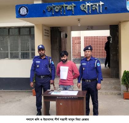 নরসিংদীর পলাশে ৫ রাউন্ড আগ্নেয়াস্ত্রের গুলি, ১২০ পিস ইয়াবা ট্যাবলেট ও নগদ ৫০ হাজার টাকাসহ শীর্ষ সন্ত্রাসী মাসুদ মিয়া (৪০)কে গ্রেপ্তার করেছে পুলিশ।