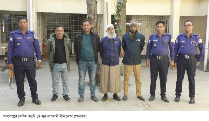 জামালপুরে পুলিশের বিশেষ অভিযান ‘ডেভিল হান্ট ফেইজ–২’-এর আওতায় কার্যক্রম নিষিদ্ধ আওয়ামী লীগ ও এর অঙ্গ–সহযোগী সংগঠনের ১৭ জন নেতাকর্মীকে গ্রেফতার করা হয়েছে। গত ২৪ ঘণ্টায় জেলার বিভিন্ন উপজেলায় অভিযান চালিয়ে তাদের গ্রেফতার করা হয়। বুধবার (১৭ ডিসেম্বর) দুপুরে গ্রেফতারকৃতদের আদালতে পাঠানো হয়েছে।