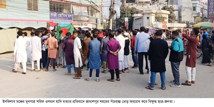 ইনকিলাব মঞ্চের মুখপাত্র শরিফ ওসমান হাদির মৃত্যুর প্রতিবাদে জামালপুরে রেলপথ ও সড়ক অবরোধ করে বিক্ষোভ করেছে ছাত্র-জনতা। শুক্রবার বিকেলে শহরের গেইটপাড়া এলাকায় এনসিপি, বৈষম্যবিরোধী ছাত্র আন্দোলন, যুবশক্তি ও ছাত্রশক্তির নেতাকর্মীরা এ কর্মসূচি পালন করেন।