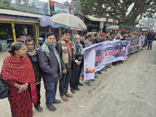 ময়মনসিংহের ভালুকায় পোশাক শ্রমিক দীপু চন্দ্র দাসকে আগুনে পুড়িয়ে নৃশংসভাবে হত্যার ঘটনায় জড়িতদের দৃষ্টান্তমূলক বিচারের দাবিতে বরিশালের গৌরনদীতে মানববন্ধন ও সমাবেশ অনুষ্ঠিত হয়েছে।