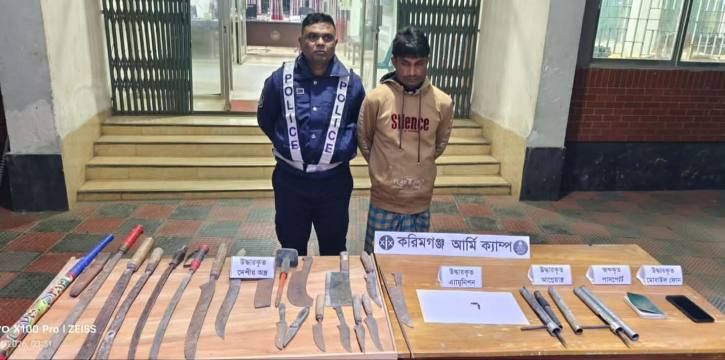 জানা যায়,শনিবার রাত ২টা ৪০ মিনিটের দিকে করিমগঞ্জ সেনা ক্যাম্পের নেতৃত্বে যৌথবাহিনী অভিযান চালিয়ে তাড়াইল উপজেলার দিগদাইড় ইউনিয়নের শেরুয়াকান্দা গ্রাম থেকে বিপুল পরিমাণ দেশীয় অস্ত্র উদ্ধার করে। এ সময় ফারুক (২৬) নামের এক যুবককে আটক করা হয়।