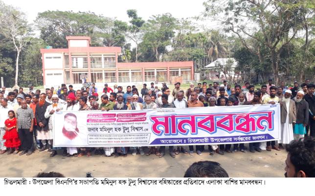 চিতলমারী উপজেলা বিএনপি সভাপতি মমিনুল হক টুলু বিশ্বাসকে দল থেকে বহিস্কারের প্রতিবাদে তার সমর্থক নেতাকর্মী ও এলাকাবাসী মানববন্ধন করেছেন। বৃহস্পতিবার (২৯ জানুয়ারি) সকাল সাড়ে ১০টায় উপজেলার সরকারি এস.এম. মাধ্যমিক বিদ্যালয়ের গেটের সামনে সড়কে এবং পাটরপাড়া সরকারি প্রাথমিক বিদ্যালয়ের মাঠে এই মানববন্ধন কর্মসূচি পালন করা হয়।