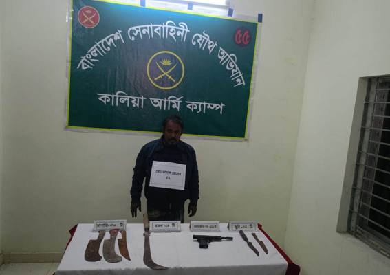 এসময় তার কাছ থেকে একটি ওয়ান শুটার গান,একটি রামদা,তিনটি চাপাতি ও দুটি ছুরি উদ্ধার করেছে। সকাল সাড়ে দশটার দিকে উদ্ধার করা অস্ত্রসহ কামাল হোসেন মোল্যা কে কালিয়া থানা পুলিশের কাছে হন্তান্তর করে।