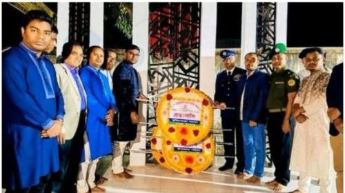 প্রভাত ফেরি শেষে শহীদ মিনারে পুষ্পস্তবক অর্পণ ও এক মিনিট নীরবতা পালন করা হয়।