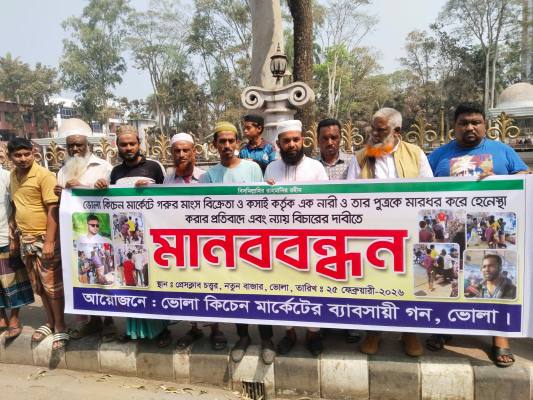 ভোলা কিচেন মার্কেটে এক নারী ও তার পুত্রকে মারধর ও হেনস্থার অভিযোগে অভিযুক্ত গরুর মাংস বিক্রেতার দৃষ্টান্তমূলক শাস্তির দাবিতে স্থানীয় ব্যবসায়ীরা মানববন্ধন করেছেন। বুধবার (২৫ ফেব্রুয়ারি) সকাল ১১টায় ভোলা প্রেসক্লাব-এর সামনে এই কর্মসূচি অনুষ্ঠিত হয়।
