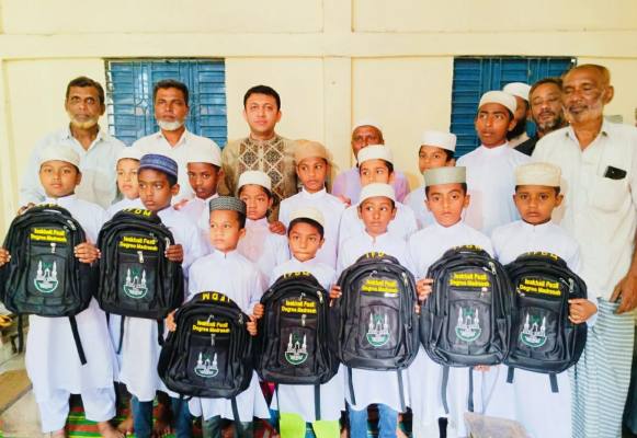 বুধবার (১৮ মার্চ) দুপুরে উপজেলার গজারিয়া ইউনিয়নের তালতলী বাজার সংলগ্ন ইছাখালী দারুল মাসাকীন ইসলামিয়া এতিমখানায় এ বিতরণ কর্মসূচির আয়োজন করা হয়। স্থানীয় দুই জাতীয় গণমাধ্যমের সাংবাদিকদের উদ্যোগে পাঞ্জাবি-পায়জামা এবং এক নির্বাহী প্রকৌশলীর সহযোগিতায় মাদ্রাসার ব্যাগ বিতরণ করা হয়।