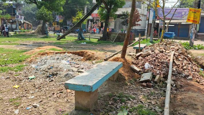 এদিকে নির্মাণ সামগ্রী ফেলে রাখার কারণে মাঠের পানি নিষ্কাশন ব্যবস্থা মারাত্মকভাবে ব্যাহত হয়েছে। সামান্য বৃষ্টিতেই মাঠে হাঁটু সমান পানি জমে, যা খেলাধুলার জন্য বড় বাধা হয়ে দাঁড়িয়েছে এবং দুর্ঘটনার ঝুঁকি বাড়াচ্ছে। এর সঙ্গে যুক্ত রয়েছে নতুন আরেকটি সমস্যা। মাঠের পূর্ব পাশে সপ্তাহে পাঁচ দিন ভোর ৬টা থেকে সাড়ে ১১টা পর্যন্ত কাঁচাবাজার বসে, যেখানে পাইকারি কেনাবেচা চলে।