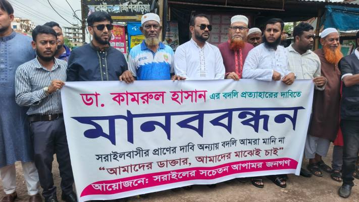 সরাইলে ডা. কামরুল হাসানের বদলি প্রত্যাহারের দাবিতে মানববন্ধন