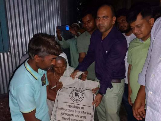 উক্ত ঘটনার খবর পেয়ে উপজেলা নির্বাহী অফিসার নাদির হোসেন শামীম তাদের বাড়িতে গিয়ে অসহায় পরিবারের হাতে ২০ কেজি চাল,২ কেজি তেল,২ কেজি চিনি,২ কেজি ডাল, বিস্কুট ও অন্যান্য খাবার সহ ৩০ কেজি শুকনো খাবারের প্যাকেট তুলে দেন।