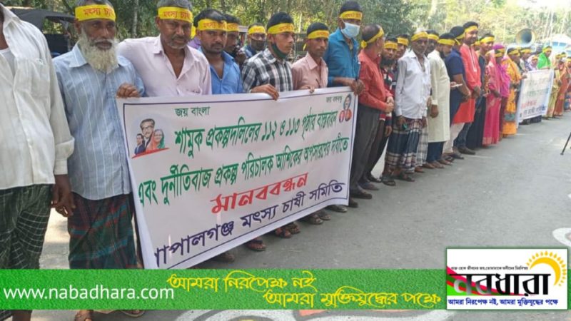 টুঙ্গিপাড়ায় প্রকল্প পরিচালকের অপসারনসহ দুই দফা দাবীতে মৎস্যজীবী সমিতির মানববন্ধন