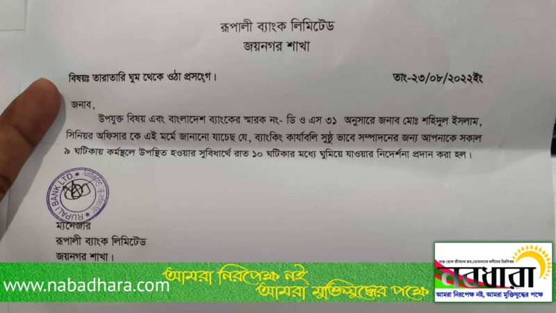 তবে ২৩ আগষ্ট ইস্যুকৃত ব্যাবস্থাপকের দেয়া চিঠির একটি কপি নবধারার হাতে এসে পৌছেছে। তাতে ঐ শাখার ব্যাবস্থাপক লিখেছেন, “উপযুক্ত বিষয় এবং বাংলাদেশ ব্যাংকের স্মারক নং-ডিওএস ৩১ অনুসারে জনাব মোঃ শহিদুল ইসলাম, সিনিয়র অফিসারকে এই মর্মে জানানো যাচ্ছে যে, ব্যাংকিং কার্যক্রম সুষ্ঠভাবে সম্পাদনের জন্য আপনাকে সকাল ৯ ঘটিকায় কর্মস্থলে উপস্থিত হওয়ার সুবিধার্থে রাত ১০ ঘটিকার মধ্যে ঘুমিয়ে যাওয়ার নির্দেশনা প্রদান করা হল।”