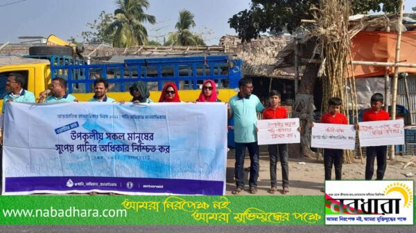 বাংলাদেশের উপকূলীয় জনগোষ্ঠীর জন্য সুপেয় পানির সার্বজনীন, ন্যায্য ও টেকসই প্রবেশগম্যতা নিশ্চিত করতে সরকারি বরাদ্দ ও বিনিয়োগ বৃদ্ধির সাথে সাথে ভূগর্ভস্থ পানির ব্যবহার বন্ধ করা, এলাকা ভিত্তিক বড় বড় পুকুর, খাল, জলাশয় খনন করে তাতে বৃষ্টির পানি ধরে রাখার ব্যবস্থা করা, খাস জমিতে মিঠা পানির আধার তৈরি করার দাবিতে ওয়াটার মার্চ অনুষ্ঠিত হয়েছে। আন্তর্জাতিক মানবাধিকার দিবস ২০২২ উপলক্ষে (রবিবার)সকালে বাগেরহাট প্রেসক্লাবের সামনে থেকে শুরু হওয়া ওয়াটার মার্চটি মংলায় শেষ হয়। ‘পানি অধিকার মানবাধিকার, উপকূলীয় সকল মানুষের পানি অধিকার নিশ্চিত করো’ প্রতিপাদ্যকে সামনে রেখে বাঁধন মানব উন্নয়ন সংস্থা এবং,একশন এইড বাংলাদেশ এর আয়োজনে উপকূলজুড়ে পানি অধিকার প্রচারাভিযানের অংশ হিসাবে এ ওয়াটার মার্চ অনুষ্ঠিত হয়।