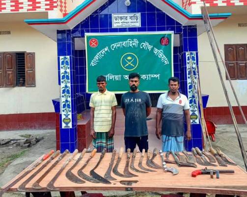 এ সময় তাদের কাছ থেকে একটি ওয়ান শুটারগান,১৭টি রামদা,তিনটি চাইনিজ কুড়াল,চারটি চাপাতি,একটি বল্লাম, চারটি টেটা উদ্ধার করে যৌবাহিনী।