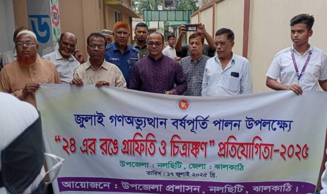 ঝালকাঠির নলছিটিতে উপজেলা প্রশাসনের উদ্যোগে ‘জুলাই গণঅভ্যুত্থান’ বর্ষপূর্তি উপলক্ষে চিত্রাঙ্কন ও গ্রাফিতি প্রতিযোগিতা অনুষ্ঠিত হয়েছে।
