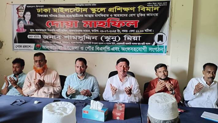 ঢাকার মাইলস্টোন স্কুল অ্যান্ড কলেজের প্রশিক্ষণ বিমান দুর্ঘটনায় নিহত শিক্ষার্থীদের আত্মার মাগফিরাত এবং আহতদের দ্রুত সুস্থতা কামনায় ফরিদপুরের আলফাডাঙ্গা উপজেলায় এক দোয়া মাহফিল অনুষ্ঠিত হয়েছে।