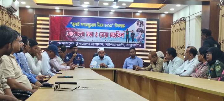 ঠাকুরগাঁওয়ের বালিয়াডাঙ্গীতে শ্রদ্ধা ও ঐতিহাসিক গুরুত্বের সঙ্গে পালিত হলো ‘জুলাই গণঅভ্যুত্থান দিবস ২০২৫’। মঙ্গলবার (৫ আগস্ট) সকাল ১০টায় উপজেলা পরিষদ মিলনায়তনে উপজেলা প্রশাসনের আয়োজনে আলোচনা সভা ও দোয়া মাহফিলের মাধ্যমে দিবসটি উদযাপন করা হয়।