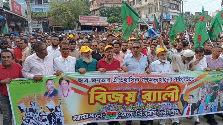 চাঁদপুরে ছাত্র-জনতার ঐতিহাসিক গণঅভ্যুত্থানের বর্ষপূর্তি উপলক্ষে শহরে এক বিশাল ও বর্ণাঢ্য বিজয় র্যালি করেছে জেলা বিএনপি। ৬ আগস্ট (বুধবার) বিকেলে চাঁদপুর বাসস্ট্যান্ড থেকে এই র্যালি শুরু হয়ে শহরের প্রধান সড়কগুলো প্রদক্ষিণ করে জেলা বিএনপির কার্যালয়ে গিয়ে শেষ হয়।
