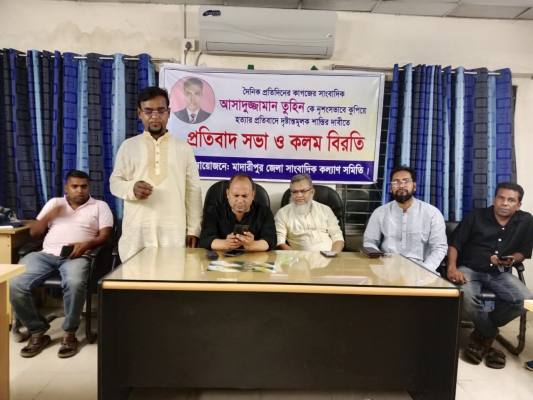 গাজীপুরের দৈনিক প্রতিদিনের কাগজ–এর সাংবাদিক আসাদুজ্জামান তুহিন হত্যাকাণ্ডের বিচার ও আসামিদের দৃষ্টান্তমূলক শাস্তির দাবিতে মাদারীপুর জেলা সাংবাদিক কল্যাণ সমিতি উদ্যোগে প্রতিবাদ সভা ও কলম বিরতি কর্মসূচি পালন করা হয়েছে।