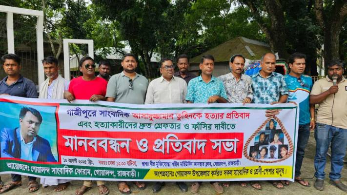 গাজীপুরের সাংবাদিক আসাদুজ্জামান তুহিন হত্যাকান্ডে জড়িত সকল অপরাধীর দ্রুত গ্রেফতার ও ফাঁসির দাবিতে রাজবাড়ীর গোয়ালন্দে “গোয়ালন্দ সাংবাদিক ফোরাম” রোববার দুপুর ১২টায় মানববন্ধন ও প্রতিবাদ সভার আয়োজন করে। সভাটি শহীদ মুক্তিযোদ্ধা ফকির মহিউদ্দিন আনসার ক্লাব মাঠ প্রাঙ্গণে অনুষ্ঠিত হয়।
