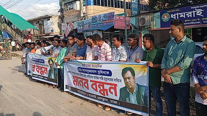 গাজীপুরের সাংবাদিক তুহিন হত্যার প্রতিবাদে এবং হত্যাকারীদের দ্রুত গ্রেপ্তার ও দৃষ্টান্তমূলক শাস্তির দাবিতে ধামরাই প্রেসক্লাবের উদ্যোগে মানববন্ধন অনুষ্ঠিত হয়েছে।