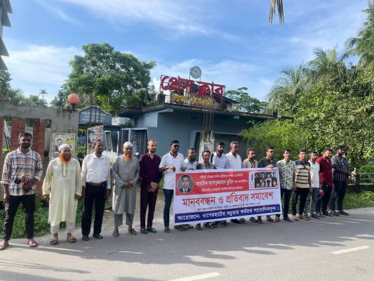 রবিবার (১০ আগস্ট) সকাল ১০টায় কচুয়া প্রেসক্লাবের সামনে উপজেলা গেট সংলগ্ন প্রধান সড়কে এ কর্মসূচি পালন করা হয়। মানববন্ধনে বক্তারা তুহিন হত্যার সঙ্গে জড়িতদের দ্রুত গ্রেফতার করে বিচার নিশ্চিত ও মৃত্যুদণ্ড কার্যকরের দাবি জানান। একইসঙ্গে সাংবাদিক সাগর-রুনি হত্যার বিচারসহ সারা দেশে সাংবাদিক নির্যাতন বন্ধের জোর আহ্বান জানান।