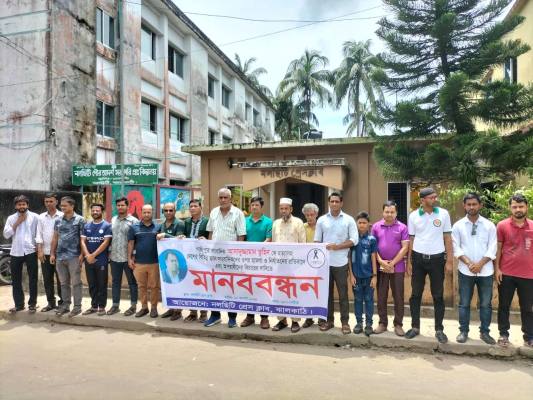 মঙ্গলবার সকাল ১১টায় নলছিটি প্রেসক্লাবের উদ্যোগে প্রেসক্লাবের সামনে সড়কে ঘণ্টাব্যাপী এ মানববন্ধনে প্রেসক্লাবের সদস্যদের পাশাপাশি বিভিন্ন শ্রেণি-পেশার মানুষ অংশ নেন।