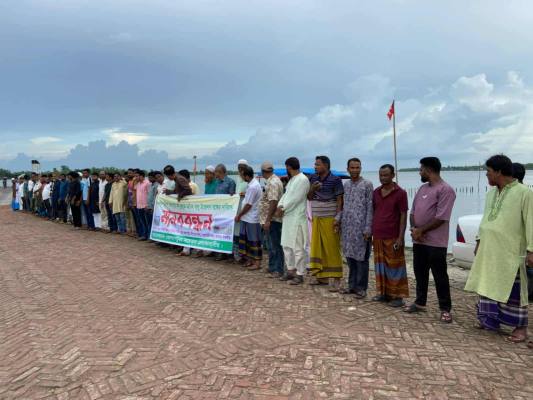 খোলপেটুয়া সচেতন বাসী” ব্যানারে আয়োজিত মানববন্ধনে সভাপতিত্ব করেন হাবিবুল্লাহ। বক্তারা বলেন, খোলপেটুয়া নদীর দুই পাশে থাকা পদ্মপুকুর, আটুলিয়া, কাশিমাড়ী, গাবুরা ও বুড়িগোয়ালীনি ইউনিয়নের বিভিন্ন এলাকার উপকূল রক্ষা বাঁধ প্রতিনিয়ত ভেঙে যাচ্ছে। অথচ এক শ্রেণির অসাধু বালু ব্যবসায়ী প্রতিরাতে ৩০-৩৫টি বডি ও কার্গো দিয়ে এসব এলাকার চর থেকে ড্রেজিংয়ের মাধ্যমে বালু তুলছে।