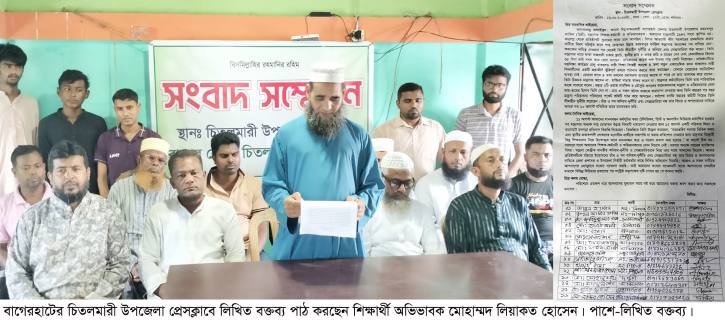শনিবার (১৬ আগস্ট) বেলা ১২টায় চিতলমারী উপজেলা প্রেসক্লাবে অনুষ্ঠিত এ সংবাদ সম্মেলনে লিখিত বক্তব্য পাঠ করেন শিক্ষার্থী অভিভাবক মোহাম্মদ লিয়াকত হোসেন।
