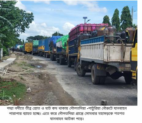 ফলে দৌলতদিয়া ঘাট এলাকায় মহাসড়কে যানজট তৈরি হয়েছে। নদী পার হওয়ার অপেক্ষায় রয়েছে দুই শতাধিক পণ্যবাহী ট্রাক ও কাভার্ডভ্যান। চালক ও সহকারীরা দীর্ঘ সময় আটকে থেকে চরম ভোগান্তির শিকার হচ্ছেন।
