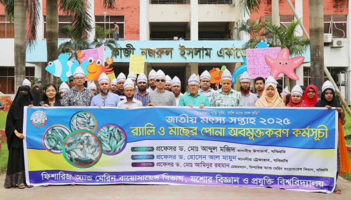 যশোর বিজ্ঞান ও প্রযুক্তি বিশ্ববিদ্যালয়ে (যবিপ্রবি) গবেষণা পুকুরে পোনা অবমুক্তকরণ, শোভাযাত্রা, সংক্ষিপ্ত আলোচনা সভাসহ নানা আয়োজনে জাতীয় মৎস্য সপ্তাহ-২০২৫ উদযাপন করা হয়েছে। এ বছর জাতীয় মৎস্য সপ্তাহ উদযাপনের প্রতিপাদ্য হচ্ছে— ‘অভয়াশ্রম গড়ে তুলি, দেশি মাছে দেশ ভরি।’