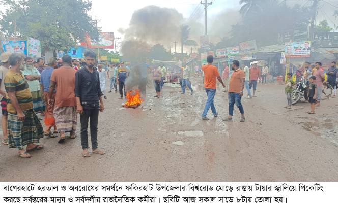 ফকিরহাট উপজেলার কাটাখালী মোড়, টাউন নওয়াপাড়া মোড়, ফকিরহাট বিশ্বরোড মোড়, ফলতিতা-বটতলা এলাকায় সড়ক অবরোধ ও টায়ার জ্বালিয়ে প্রতিবন্ধকতা সৃষ্টি করেছেন হরতাল-সমর্থকরা। এসময় বিভিন্ন রাজনৈতিক দলের কর্মী ছাড়াও সাধারণ মানুষকে সড়কে অবস্থান নিতে দেখা যায়। তবে রাস্তায় থাকা লোকজন জরুরি সেবা ও অ্যাম্বুলেন্স চলাচলে কোনো বাধা দেয়নি।