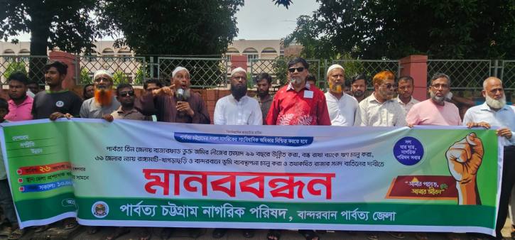 বাজারফান্ড ভূক্ত জমির লিজের মেয়াদ বৃদ্ধি, ব্যাংক ঋণ চালু, ৬১ জেলার ন্যায় তিন পার্বত্য জেলায় ভূমি ব্যবস্থাপনা কার্যকর করা ও রাজার সনদ বাতিলসহ বিভিন্ন দাবিতে বান্দরবানে মানববন্ধন করেছে পার্বত্য চট্টগ্রাম নাগরিক পরিষদ।