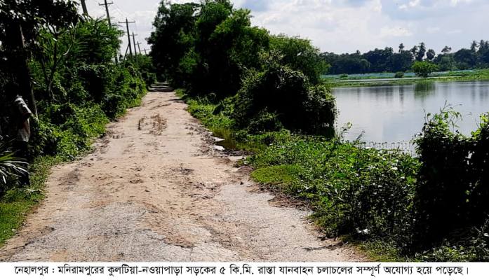 যশোরের মনিরামপুর উপজেলার কুলটিয়া-নওয়াপাড়া সড়কের অন্তত ৫ কিলোমিটার অংশ বর্তমানে যানবাহন চলাচলের সম্পূর্ণ অযোগ্য হয়ে পড়েছে। প্রায় ৮ কিলোমিটার দীর্ঘ এই সড়কটি উপজেলার কুলটিয়া, নেহালপুর, মনোহরপুর, দূর্বাডাঙ্গা ইউনিয়নসহ আশপাশের বেশ কয়েকটি ইউনিয়নের জনগণের যাতায়াতের প্রধান মাধ্যম। অথচ বর্তমানে এ সড়কে প্রতিদিন শত শত মানুষ ও যানবাহন চরম ঝুঁকি নিয়ে চলাচল করছে।